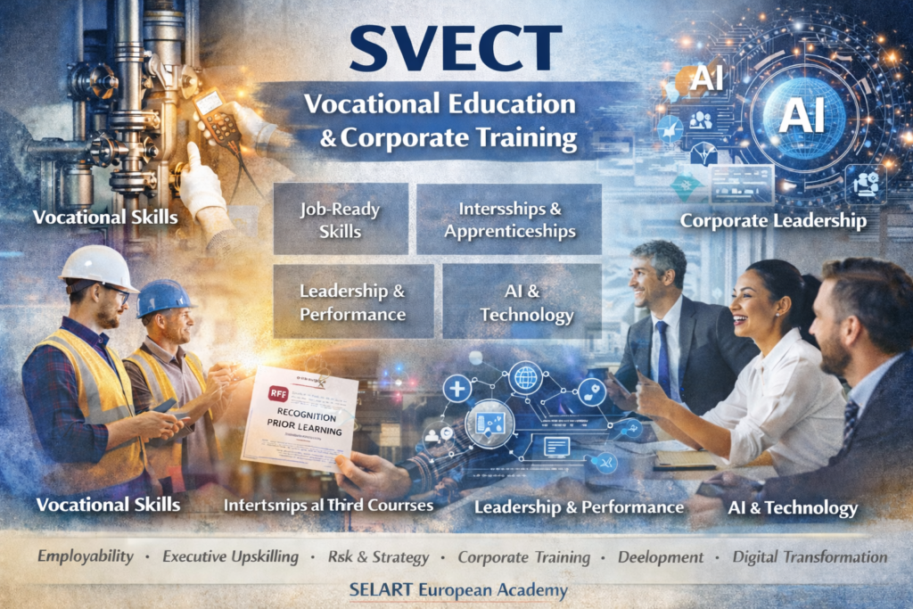SELART European Academy offers the SVECT (SELART Vocational Education & Corporate Training) the pedagogical pillar as a practical, industry-connected learning pathway delivered in flexible formats: online, hybrid, and face-to-face (offline). Programs are available in different durations, short-term, mid-term, and one-year formats, so adults, young professionals (18+), and organizational teams can choose the learning intensity that best matches their goals, schedules, and career or performance needs. SVECT connects training to real-world industries by offering job-ready vocational programs for learners who want to enter the job market, improve employability, change careers faster, or progress in a specific vocation. It also serves executives and professional teams across non-education sectors (corporate, governmental, NGOs, and private/public institutions) through practical, performance-driven corporate trainings.